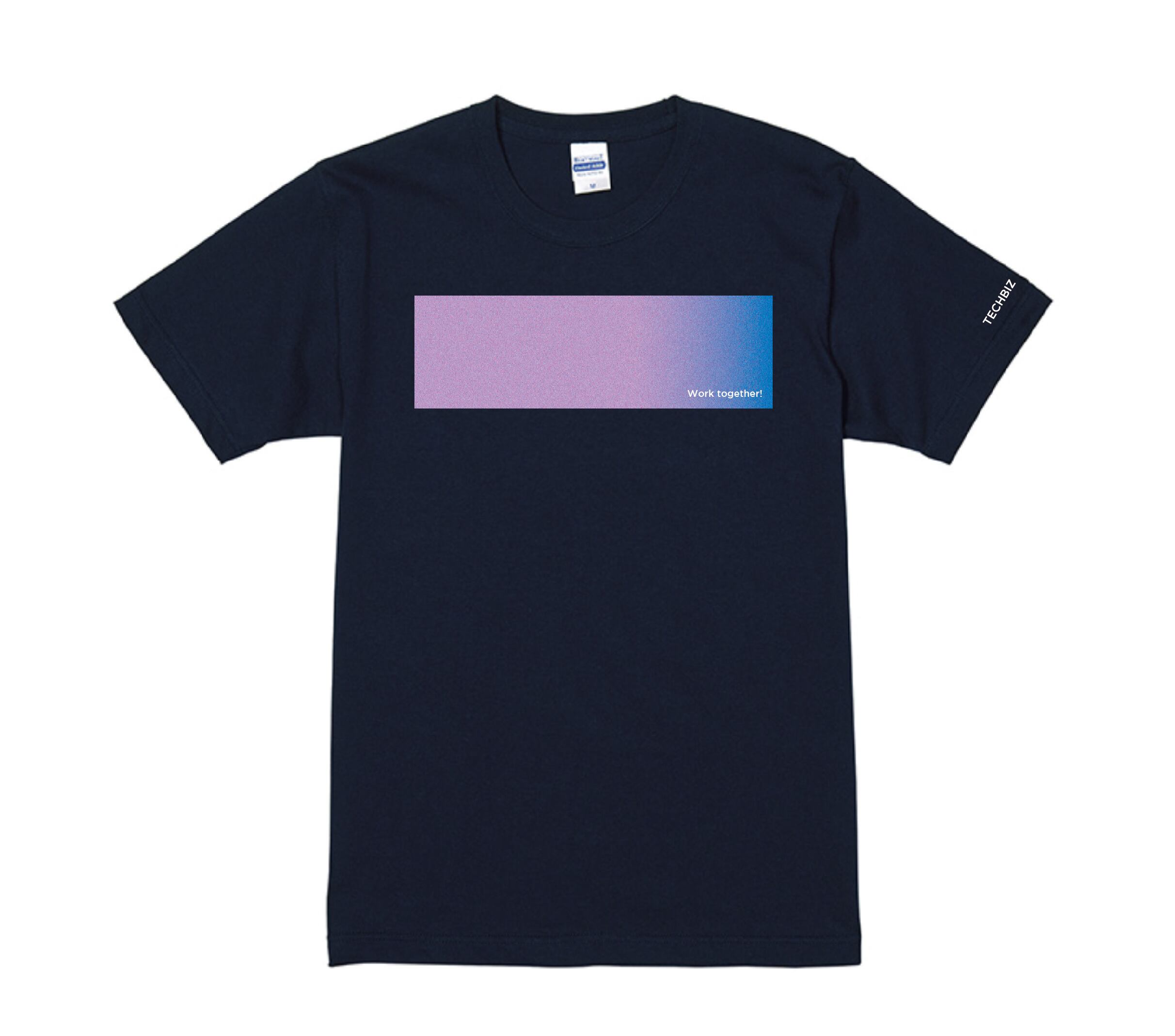 シャリ感のあるしっかりした風合いが特徴。着用を重ねることで目が詰まり、他では決して味わえない肌ざわり。胸には「work together!」をイメージしたグラフィックが大胆にプリントされ、左袖に「TECHBIZ」のロゴもプリントされている。